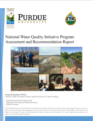 The reports—created by Purdue University's Natural Resources Social Science team members Emily Usher, Dr. Sarah Church (now at Montana State University), Jackie Getson and lab director Dr. Linda Prokopy—and CTIC are based on forums in five watersheds, extensive phone interviews, and a national survey. The project was funded by the USDA Natural Resources Conservation Service (NRCS) to guide improvements to the service's National Water Quality Initiative (NWQI) Program.